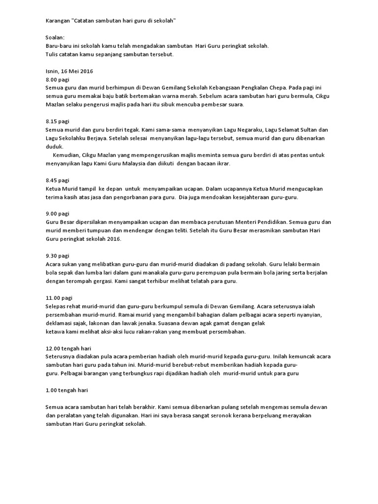 Pada tahun ini iaitu tahun 2004 sambutan hari kemerdekaan negera bertempat di kuantan pahang. Contoh karangan laporan sambutan kemerdekaan peringkat sekolah. Jom kita tinjau apa idea aktiviti menarik yang boleh dijalankan untuk sambutan tersebut. Semangat kecintaan terhadap negara secara tak langsung dapat diserapkan kepada anak pelajar melalui program program seumpama ini.