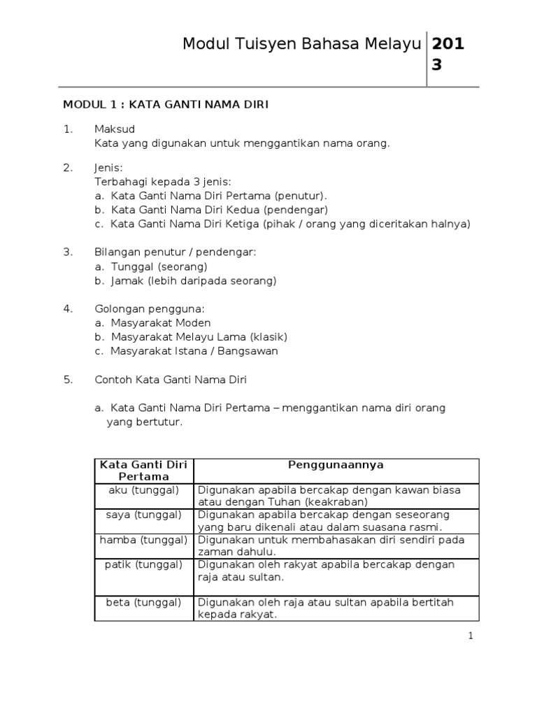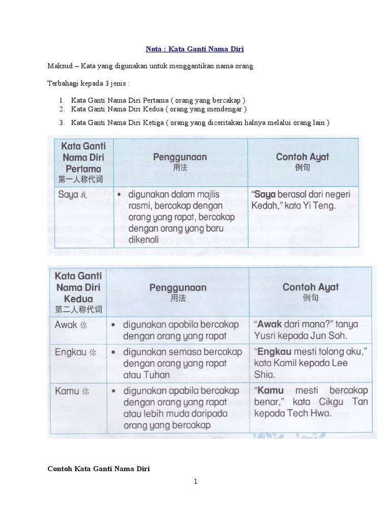 Kata Ganti Nama Diri Bahasa Melayu Sekolah Rendah