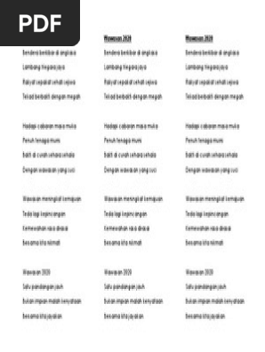 Lirik lagu wawasan 2020. Wawasan 2020 bendera berkibar di angkasa lambang negara jaya rakyat sepakat sehati sejiwa dengan berbakti dengan megah hadapi cabaran masa muka penuh tenaga murni bakti dicurah sehara sehala dengan wawasan yang suci wawasan meningkat kemajuan tiada lagi kepincangan kemewahan rasa dirasai bersama kita nikmati wawasan 2020 satu pandangan jauh. Bendera berkibar di angkasa lambang negara gagah rakyat sepakat. Bendera berkibar di angkasa lambang negara gagah rakyat sepakat sehati sejiwa tekad berbakti dengan megah. Hadapi cabaran masa muka penuh tenaga murni bakti dicurah sehara sehala dengan wawasan yang suci.