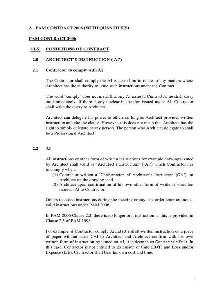 Contract using pam 2006 with quantities contractor will use quantities in bq as the contract basis. Malaysia pam standard form of contract 2006 wthout qty pdf. Clause 12 quality and quantity of works. Clause 11 variation.